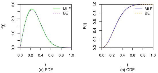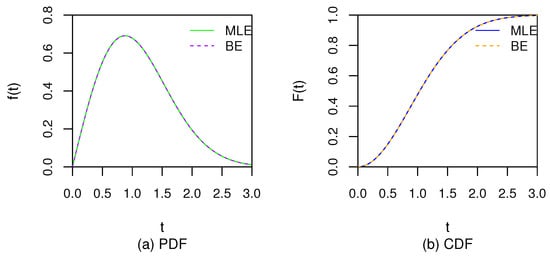 In lifetime data analysis, due to the complex internal structure and external environment, units frequently fail for a variety of causes, such failure causes are called competing risks in the literature and compete with each other in the whole life cycle. In standard sketches, the observed competing risks data of each unit is the earliest occurrence among all the causes, and the data includes the lifetime as well as the cause indicator. Under conventional studies, discussions for the competing risks model are usually made based on the assumption that all causes of failure are independent for the purpose of simplicity and concision. Such independent based competing risks models have been discussed by many authors, for example, some works of Mao and Shi [], Varghese and Vaidyanathan [], Davies and Volterman [], Lodhi et al. [], and Ren and Gui []. For more details, one can refer to the monographs by Crowder [] for review. However, according to the actual operating mechanism of living products, the assumption of independence is often untenable in practice. For example, in the study of colon cancer, the factors of failure are cancer recurrence or death, and Lin et al. [] mentioned that these two factors are dependent. For a plane with four engines, if one of the engines breaks down, the other engines will bear more pressure and have a greater possibility of failure. Thus, the plane has a higher risk of breaking down. It can be found that as the causes of plane failure, these engines are positively dependent. In addition, the dependent competing risks also exist in the diabetic retinopathy study that was carried out by the National Eye Institute. This study aimed to discuss the effect of laser treatment in delaying the onset of blindness in patients with diabetic retinopathy. For each patient in this study, one eye was chosen for laser treatment and the other was not. The final observed data includes the minimum time to blindness and indicator pointing the treated or other eye failed first. Besides, the study also recorded the associated data on simultaneous blindness of both eyes. Obviously, there is some connection between the lifetimes of two eyes for each patient in this situation. Hence, it is more appropriate to utilize a dependent competing risks model to describe the relationship between all failure causes. In general, the dependent competing risks model could be used to provide more accurate inferential results than the independent one. When two dependent failure causes of an individual exist, the Marshall–Olkin bivariate type model may provide better fitting for dependent competing risk data. In literature, the Marshall–Olkin bivariate exponential (MOBE) distribution was firstly proposed by Marshall and Olkin [] due to its nice distributional properties and concise form, and some other Marshall–Olkin bivariate type distributions have also been further extended and studied by many authors. For instance, Feizjavdian and Hashemi [] investigated Diabetic retinopathy data by using Marshall–Olkin bivariate Weibull distribution (MOBW). Bayesian analysis of dependent competing risks model utilizing Marshall–Olkin bivariate Pareto (MOBP) distribution was considered by Paul et al. []. Shen and Xu [] studied the parameter estimation of MOBW distribution based on different methods. Wang et al. [] considered the statistical inference of the dependent competing risks model by using the MOBW distribution.