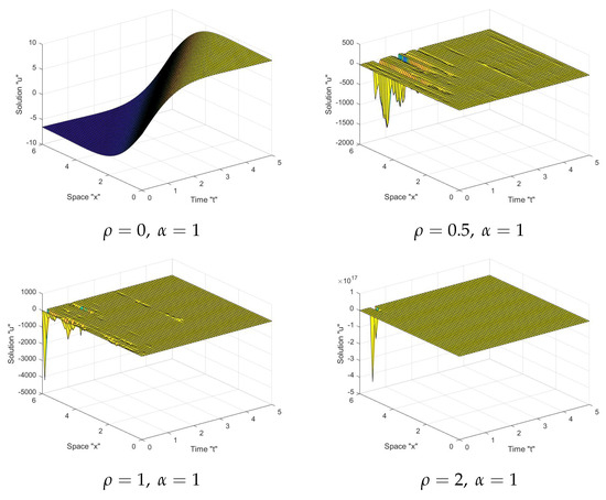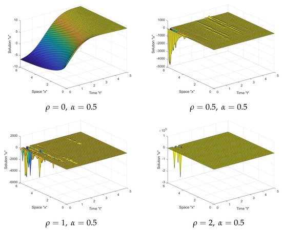 In Figure 1, Figure 2 and Figure 3, as seen in the first graph in each figure, the surface becomes less flat when the noise intensity is equal to zero. However, when noise appears and the strength of the noise grows (), we notice that the surface becomes more planar after minor transit behaviors. This indicates that the solutions are stable due to the multiplicative noise effects.