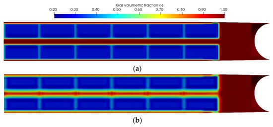 A first simulation, which addresses the firing of five modules in a 155/39 howitzer (Figure 8), allows us to observe the combustion sequence predicted by the code. In particular, contours of the void fraction are shown, in a representation of a longitudinal section of the fluid domain (since there is axial symmetry, only one of the two halves is represented, for the sake of clarity). It can be seen in the first frame (Figure 8a), which represents the initial conditions, that = 1 in the central zone (next to the symmetry axis), in the region near the walls of the chamber, and around the bottom of the projectile. Inside the modules, however, 0, since the regions occupied by the propellant also contain air, in the gaps between the grains and inside the perforations. In these regions, the value of the void fraction is the minimum possible, the critical porosity, which corresponds to 0.305. Of course, this approximation is the result of the Eulerian conception of the system of equations. Later, once the sequence begins and the combustion progresses (Figure 8b,c), it can be seen how the boundary between the solid and the gas is blurred. In observing the numerical results, it was determined that this phenomenon does not correspond only to the effect of combustion, but also to the numerical diffusion itself that takes place in the solid phase, and this does not respond to the physics of the problem.
