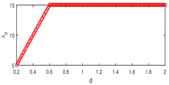 Figure 11. and r change with d. . - When the synchronization domain is bounded, with the increase of in Figure 6, decreased rapidly from 114 to 6.2, and then increased slowly to 7, and decreased rapidly from 111 to 3.2, and then increased slowly to 3.4; with the increase of in Figure 7, increased slowly from 4.6667 to 7.6667, and remains unchanged at 4.6667; with the increase of in Figure 8, decreased slowly from 7.6667 to 5.4137, and then increased slowly to 8.2, and decreased slowly from 4.6667 to 4.004, and then increased slowly to 8.2; with the increase of in Figure 9, increased rapidly from 19 to 32.3333, and increased rapidly from 16 to 29.3333; with the increase of K in Figure 10, decreased rapidly from 46 to 7 and then increased slowly to 10, and decreased rapidly from 23.5 to 4 and then increased slowly to 7; with the increase of d in Figure 11, decreased rapidly from 19 to 7 and then increased slowly to 9.3333, and decreased rapidly from 10 to 4 and then increased slowly to 6.3333.
