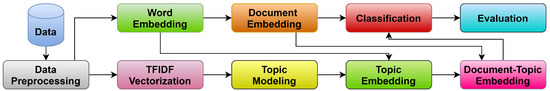 The word embedding models used in this paper are Word2Vec, FastText, and GloVe. Each embedding model (WordEmb) generates word representations in a vector space. The context of each word within a document is captured when employing these embeddings. Moreover, these models also encode both the relationship and the similarity between words from a semantic and syntactic perspective.