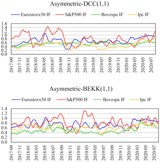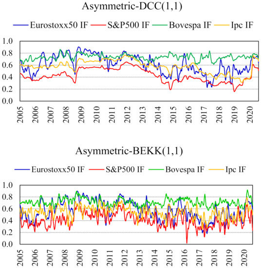 To analyze the hedging possibilities using futures contracts on other stock market indices, we estimated the MVHR following the previous methodology described for the four different futures indices EUROSTOXX 50, S&P500, BOVESPA, and IPC. To gain some insight into the relationship between the LATIBEX index and the futures markets on each of these indices, we started by estimating bivariate GARCH models over the whole sample. The GARCH model parameters are estimated by maximum likelihood under the assumption of normality of the innovations vector, so they should be interpreted as quasi-maximum likelihood estimates. Using alternative probability distributions, such as Student’s t, increases the computational cost without leading to noticeable differences in hedging results. Moreover, capturing the leverage effect in volatility seems to be more important in producing better hedging results. Figure 1 shows monthly moving averages of the conditional correlation between LATIBEX and each futures contract, estimated using the full sample (3 January 2005–25 August 2020; 4082 data points) with the asymmetric DCC– and BEKK–GARCH(1,1) models. For sake of space, we present the two models that exhibited important differences between them, that is, the asymmetric DCC– and BEKK–GARCH(1,1). The graphs for the asymmetric CCC– and DVEC–GARCH(1,1) models are available upon request.