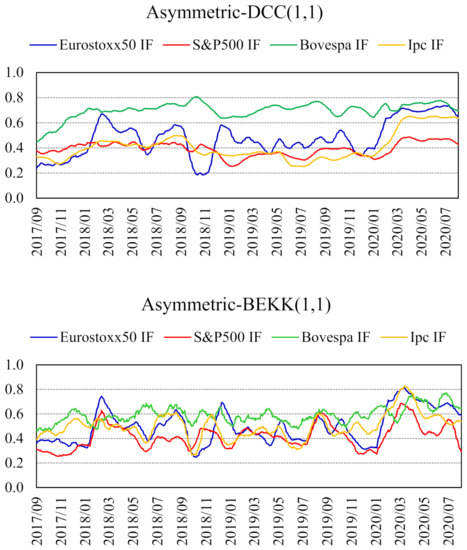 As observed in Figure 1, in the first half of the sample (2005–2012), the correlations have medium–high levels around 0.7, with the exception of S&P500 future, which in this period, exhibits a value close to 0.5. A decrease in correlations at the beginning of the Global Financial Crisis (2008–2009) is also noticed, and, then, an increase at the end of this period. Then, in the second half of the sample (2013–August 2020) the correlations tend to decrease, with EUROSTOXX 50 and IPC index futures with values around 0.5 and S&P500 future at 0.36. The exception is with the BOVESPA futures index, which remains around 0.7. Nevertheless, an increase of correlations in the last part of the graph can be noticed, as a consequence of the Covid-19 Financial Crisis, as expected. In sum, conditional correlations from the asymmetric BEKK–GARCH(1,1) specification display larger short-term fluctuations.