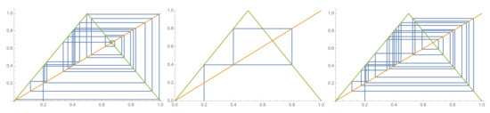 Trajectories of three initial states around the value of the dynamical system given by the tent map.