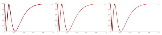 The graphs of the original function (the black lines) and its piecewise linearizations (the red lines), where .