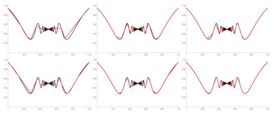 The graphs of the original function (the black lines) and its piecewise linearizations (the red lines), where , , (the first row) and , , (the second row).