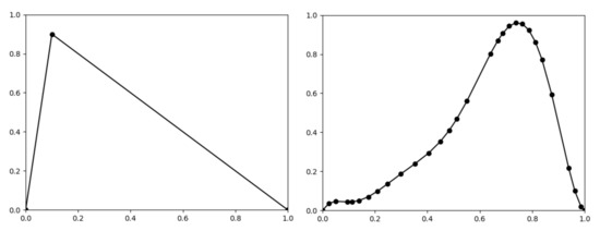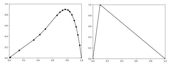 The graphs of the linearized function given by 18 points (left) and the fuzzy set given by 23 points (right).