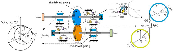In the model, the gear is an involute spur gear, and the bearing is a sliding bearing. Considering the time-varying meshing stiffness, backlash, tooth surface friction, comprehensive transmission error, nonlinear oil film force, and radial vibrations of the shaft and the torsional vibration of two gears, the coordinate system xiOiyi (i = 1 or 2) is established, in which O1 and O2 are the geometric centers of the two bearings, Oj1 and Oj2 are the centers of the two transmission shafts, and Op and Og are the geometric centers of the driving and driven gears, respectively.