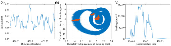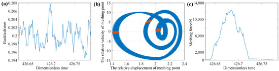 ω = 1.5, the dynamic characteristics of the gear system with 100 rounds are calculated and simulated. Then, the phase diagrams, the Poincare section diagrams, and the time domain diagrams of the system are obtained, as shown in