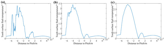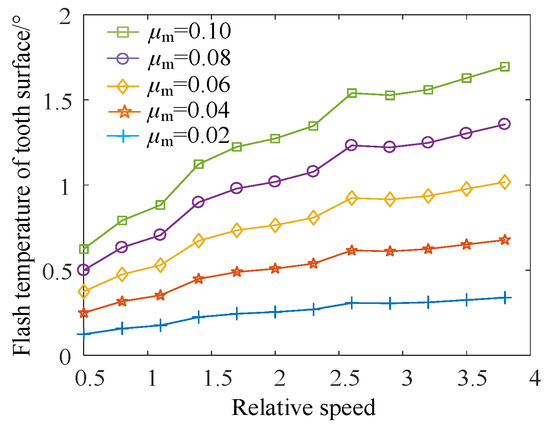 Figure 16, it can be observed that the abscissa is the relative speed of the gear system, and different lines represent the tooth surface flash temperature with different friction coefficients. Then, through increasing the relative speed and the friction coefficient, the tooth surface flash temperature increases gradually. Since the meshing force does not increase monotonically, there are some fluctuations in the changing process of flash temperature.