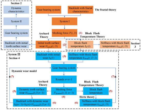 To calculate parameters (initial tooth surface wear, dynamic tooth surface wear, and tooth surface temperature), the gear-bearing systems considering different backlash and meshing stiffness are defined. Then, the gear-bearing system considering backlash with fractal characteristics is called System I, through which the meshing force is calculated; the gear-bearing system considering backlash with initial tooth surface wear is called System II, through which the system response under a wear condition is analyzed; and the gear-bearing system considering the dynamic wear model is called System III.