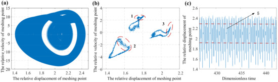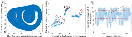 Figure 10a), which indicates that the phase trajectories of the system are widely distributed in the space; regions 1, 2, and 3 in the Poincare section diagram (