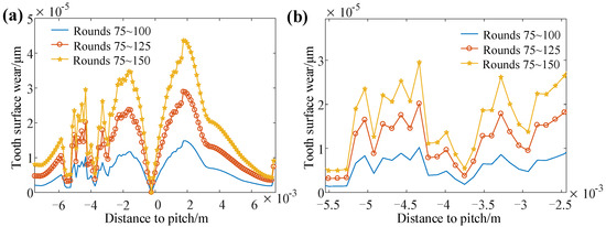 The calculation of dynamic wear is a cumulative process. Since the tooth surface wear of the previous period will affect the wear of the next period, the wear amount and the system response of each period are different. Then, the system responses (system III) of 150 rounds are calculated by using the above parameters. Since the front periods will be affected by the transient response, the dynamic cumulative wear (