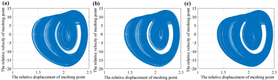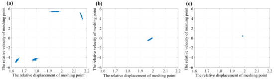Figure 15a–c represent the Poincare section diagrams obtained by the corresponding displacement and velocities with 75–100, 100–125, and 125–150 rounds, respectively. Then, it can be observed from