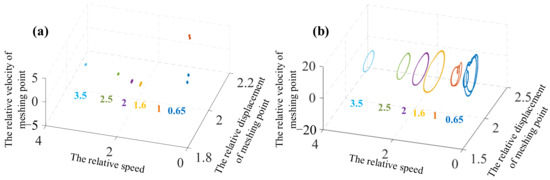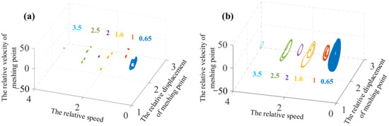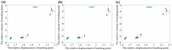 Figure 14 that the blank part in the phase diagram decreases with rotation of the gear, which indicates that the displacement and velocity of the system are widely distributed. From