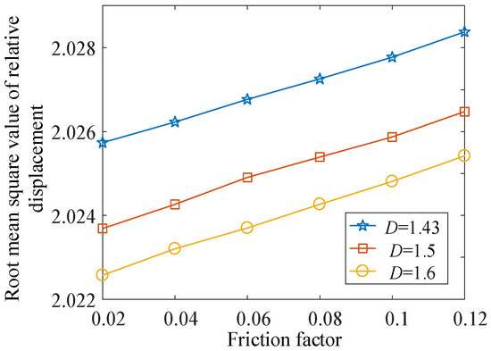 In the three cases of different initial wear amount (D = 1.43, 1.5, 1.6), taking the parameters as μm = 0.02–0.12, D = 1.43, 1.5, and 1.6, the root mean square values of system displacement are calculated. It can be concluded that the tooth surface flash temperature rises with the increase of friction coefficient. Then, the root mean square value of the vibration displacement of the system amplifies, which indicates that the system tends to be unstable.