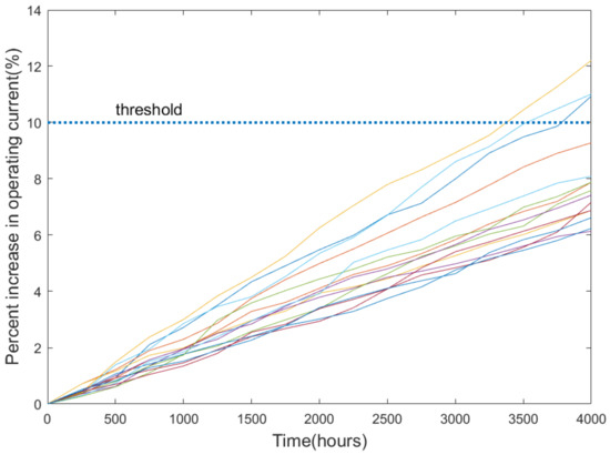 . During the experiment, the percent of operating current increase and are recorded every 250 h until 4000 h. Thus,