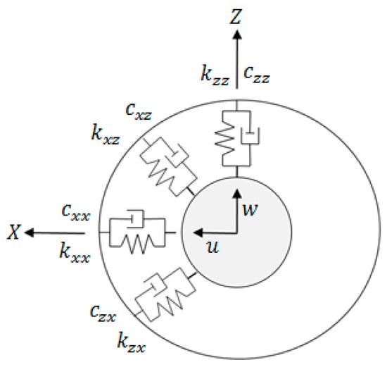 Stiffness and damping matrices provided by the bearings are obtained by determining the generalized forces that these elements exert on the rotor shaft. After applying the virtual work principle to the bearing model shown in Figure 2, forces acting on the rotor can be expressed in a matrix form as [40]