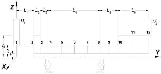 To obtain the mathematical model for the rotor-bearing system using the FE method, it was discretized into 11 beam-like elements, as is shown in Figure 3. The system includes two inertial disks located at nodes 1 and 12, while supports (bearings) are placed at nodes 4 and 8. The correct nodal location ensures that the simulation replicates the model’s real conditions. In addition, two unbalanced masses were considered in two different angular positions located on inertial disks and .