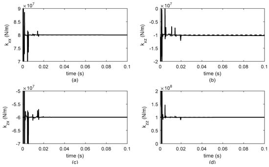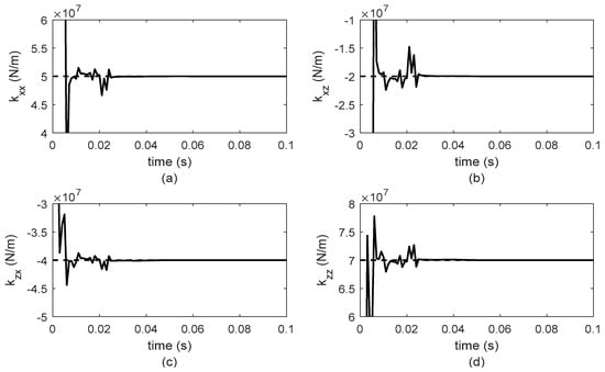 Identified stiffness parameters for bearing 2 at 600 rpm. (a) , (b) , (c) , (d) .