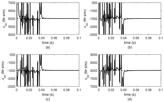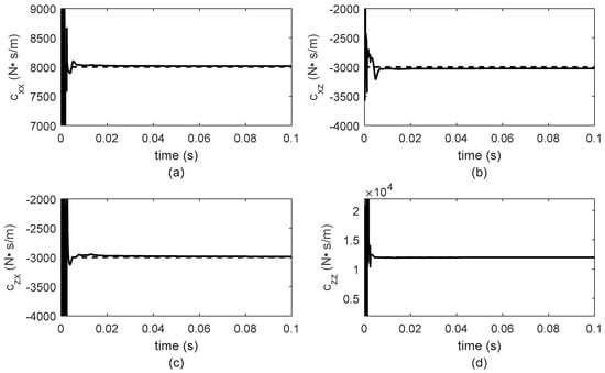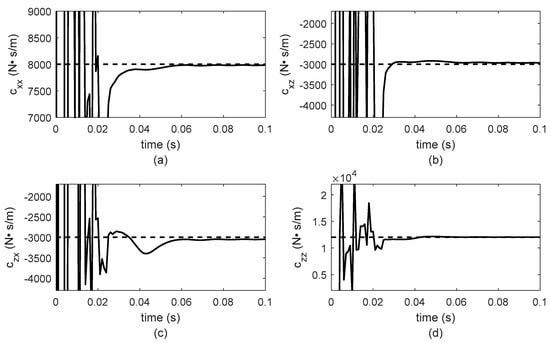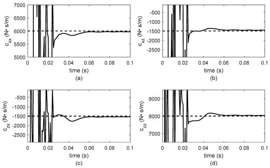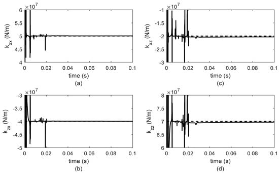 As in the case of constant rotor system velocity, stiffness and damping bearing parameters are identified in les tan 0.1 s as can be observed in Figure 10, Figure 11, Figure 12 and Figure 13. Furthermore, the parameter values remain constant until the rotor-bearing system reaches its nominal operation velocity. For a better analysis of the identifier behavior, the results for 0.1 s are presented in Figure 10, Figure 11, Figure 12 and Figure 13 because it is important to observe the required time for the identifier convergence. The sample time used to solve Equation (3) using the Newmark method was 0.1 milliseconds. The numerical solution of Equation (3) was used as input data for the proposed algebraic identifier. Moreover, achieving this sample time with diverse data acquisition systems for experimental implementation was verified.