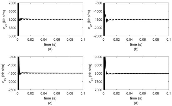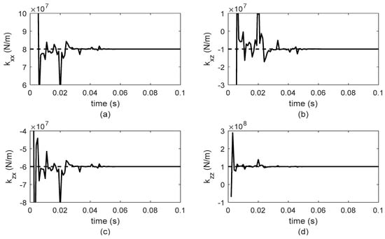 As can be observed in Figure 5, Figure 6, Figure 7 and Figure 8, the identification of both stiffness and damping parameters of the bearings is carried out in less than 0.1 s, and once the parameter reaches the identified value, this remains for the rest of the time period. For a better analysis of the identifier behavior, only results for 0.1 s are presented in Figure 5, Figure 6, Figure 7 and Figure 8, because it is important to observe the time that the identifier requires to converge to the estimated value.