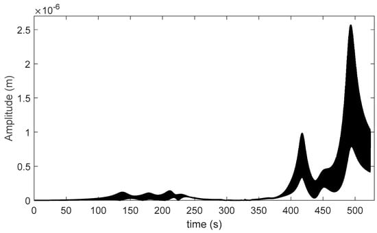 The displacement vector used as input data for the algebraic identification is obtained from Equation (3) by using the Newmark method for numerical integration and taking into account a linear ramp excitation with angular acceleration . The rotor-bearing system response at node 4 is shown in Figure 9 where the vibratory behavior of the system in the location of bearing 1 can be appreciated.