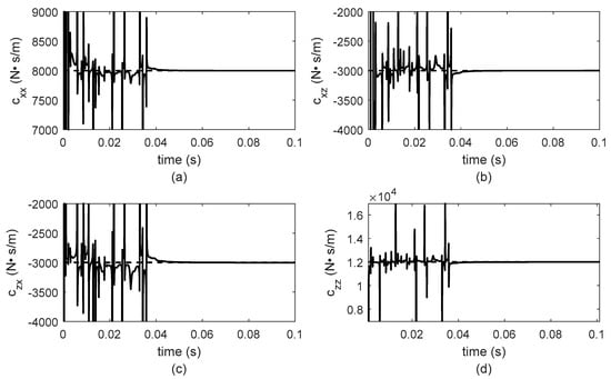 Identified damping parameters for bearing 1 with a linear ramp of excitation of . (a) , (b) , (c) , (d) .