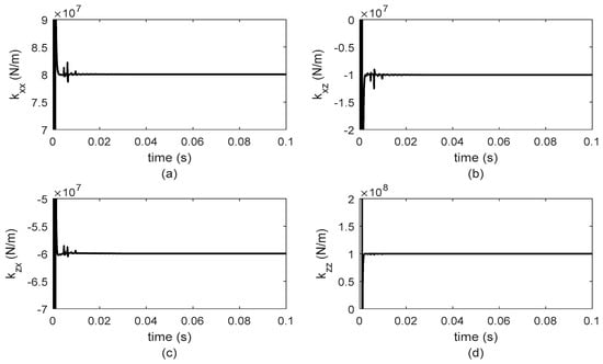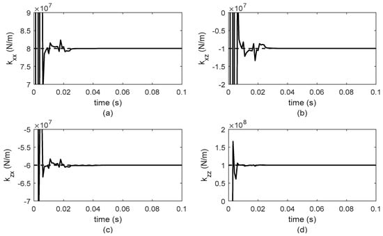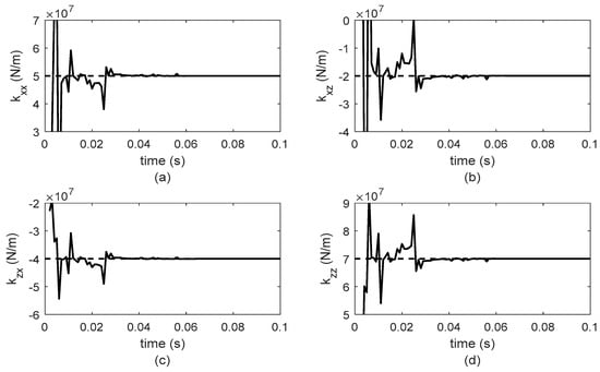 Figure 5 and Figure 6 present the obtained results from the numerical simulation for the algebraic identification of stiffness and damping parameters for bearing 1, while Figure 7 and Figure 8 show the results corresponding to bearing 2. It is important to mention that the sample time used in the simulation was 0.1 milliseconds. However, by carrying out numerical simulations with different sample times, it was observed that the shorter the sampling period, the faster the identifier converges.