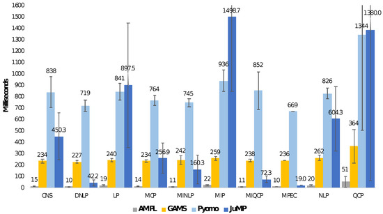 Average model instance creation time (in milliseconds) grouped by mathematical optimization problem type. Benchmark conducted by Jusevicius et al. [23] using models available in the GAMS library. It measures the time taken to load model instance and export to a format supported by the solver.