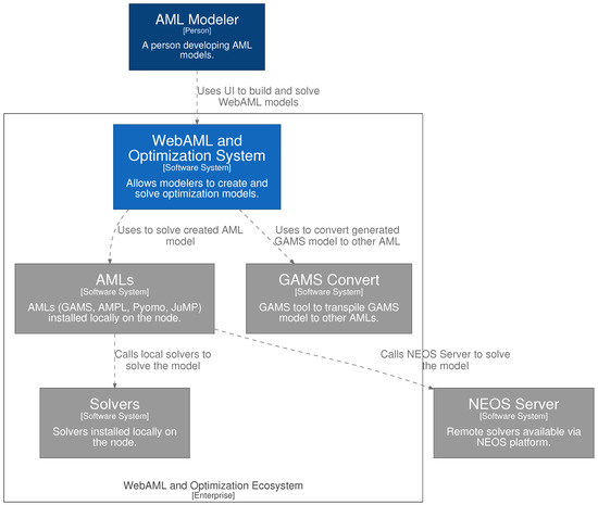 As identified in our earlier findings, we were set to build an extendable, open-source, web-based prototype combining the best characteristics of the underlying AMLs. In Figure 2, we provide the system architecture landscape viewpoint for this prototype of the universal WebAML Optimization System using C4 architecture model (The C4 model for visualizing the software architecture; https://c4model.com (accessed on 17 September 2021)) notation. A more detailed system component diagram can be seen in Figure A1. All of the code is provided on our WebAML GitHub repository [39].