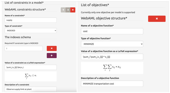 We also had to choose how to capture the mathematical equations needed to define constraints in the model. Here, we have chosen to use a well-known language, such as LATEX, instead of its less-adopted counterparts, such as ASCII Math (AsciiMath: an easy-to-write markup language for mathematics; http://asciimath.org (accessed on 17 September 2021)). This was dictated by both widespread knowledge of LATEX in academic society and the existence of libraries capable of tokenizing LATEX formulas (LATEX.js: JavaScript LATEX to HTML5 translator; https://latex.js.org (accessed on 17 September 2021)) and displaying them nicely on the Web using W3C MathML [42] standard.