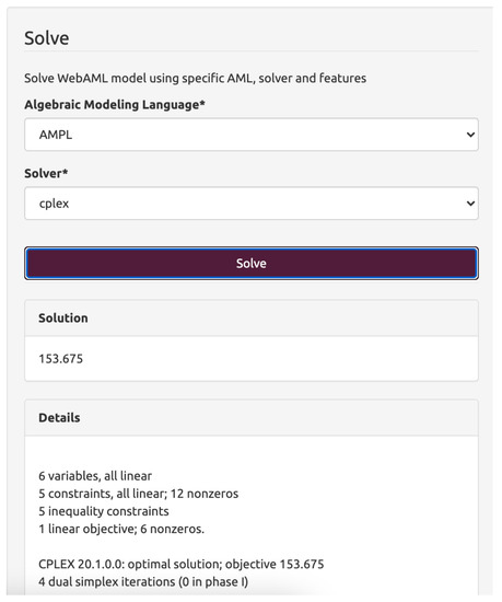 The tool does not require any specific algebraic language knowledge and allows for solving problems using different mathematical optimization solvers. Thus, it simplifies the process of algebraic modeling and mathematical optimization, making it available for individuals without detailed technical knowledge. This makes it appealing not only for enterprise users but also for teachers, lecturers, and students trying to understand the basics of mathematical optimization. Worldwide research of the usage of information and communication technology (ICT) to support, enhance, and optimize information delivery has shown that ICT can lead to improved student learning and better teaching methods (e.g., [43,44,45,46]). The tool also supports all of the solvers available in the underlying AMLs, thus providing a wide range of free and commercial solvers. Since the tool can easily be installed on a server and accessed via a web interface, an institution can acquire a full academic or commercial license and allow easy access for every member to solve large-scale optimization problems.