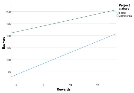 Extant literature provides strong support for the moderating effect of the project nature in the association between the number of reward levels and market size. In fact, backers with distinct motivations pledge to different types of projects (Ryu and Kim [38]). More product-seeking backers appear in the commercial projects, motivated by personal gains and tangible rewards. By contrast, other kind of incentives motivate backers interested in social projects, such as being part of a community, or supporting a social benefit related to environmental issues, social goals, education, disadvantaged groups, etc. (Younkin and Kashkooli [39], Gerber and Hui [20,40,41], Rodriguez-Ricardo et al. [42], Lin et al. [43], Dai and Zhang [44], Hong et al. [45], and Allison et al. [46]).