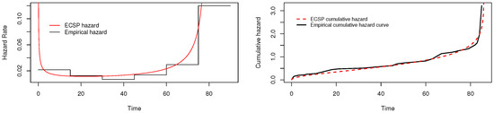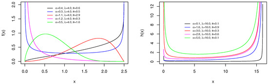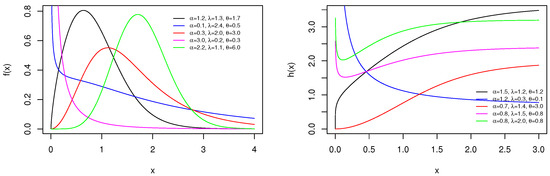 The cdf, pdf, and hrf of the ECSW distribution were obtained by considering the baseline distribution of the W distribution with sf and pdf defined as and , respectively, where . That is, for , the cdf, pdf, and hrf of the ECSW distribution were: