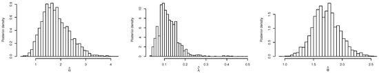 Plots of the histogram and estimated values of obtained from the Bayes estimates.