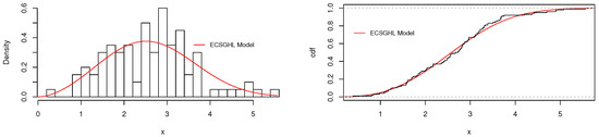 Plots of the histogram with the estimated pdf, and the empirical cdf with the estimated cdf of the ECSGHL model for real data II.