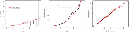 Plots of the empirical and estimated hrf, the empirical and estimated chrf, and QQ plot of the ECSGHL model for real data II.