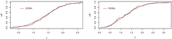 Plots of the cdf of first data with the fitted ECSW1 model, and second data with the fitted ECSW2 model.