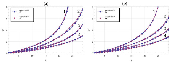 In Figure 2, we display the mean values and as varies in the interval , the service rates and of the queue vary according to specified cases, for the queue we set , in a figure labeled by (a) and , in a figure labeled by (b). As to be expected, the total mean number of customers in the system increases monotonously with increasing values of the traffic intensity and decreasing of service rates. The curves in most cases are graphically indistinguishable in the displayed domain. Only in some cases of high load there is a slight difference in the curves and in general the optimal policy has a very little advantage over the heuristic one. Thus, for different system parameters the influence of individual states of the arrival process can be neglected, so that the Routers 1 and 2 needs only the information .
