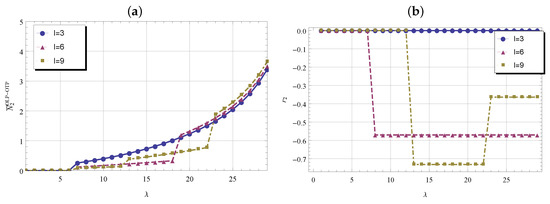 It is interesting to show the influence of the number of the phases l of the arrival process. This is done in Figure 3 and Figure 4, respectively, for the queue and , where in figures labeled by (a) we illustrate the mean number of customers in each queue operating under the HTP and by (b) a 1-lag correlation with . The arrival rate varies in the interval , the service rates in and are fixed at , , and , . We observe that the mean number of customers in each queue i changes with jumps as increases. Jumps occur where policy k changes, as can be clearly seen by the behavior of the correlation function . Moreover, the function increases non-monotonically, although the function has due to previous experiments a monotonic structure by increasing and the choice for the original system and specified service rates seems to be the better one.
