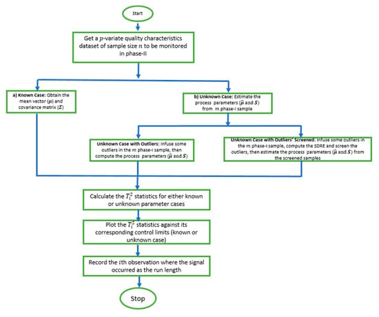 - Repeat the steps from 1–5 for 105 iterations. Record the run length for each iteration. Then, calculate the average and standard deviation of the run length as ARL0 and SDRL0, respectively.The algorithm is summarized with a flowchart presented in Figure 1 for easy readability.