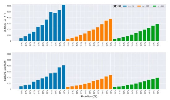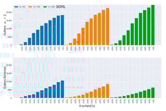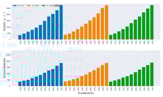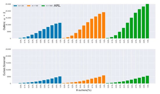 Furthermore, the rate of improvements appreciated as the percentage and magnitude of outliers increased. Figure 2, Figure 3, Figure 4 and Figure 5 depict the results in Table 3 and Table 4 (outliers without screening) side-by-side with Table 5 and Table 6 (SDRE outliers screening) to closely observe the improvements. Table 3 and Table 4 depict the IC and of the multivariate Shewhart chart from the mixed distribution in (5), with some percentages of outliers, and the magnitude . Here, all values should approximate to the nominal ARL of 370, since the environment was IC. When , it implies the absence of outliers in the process, so the ARL values for all the different m samples clustered around 370, although their SDRL values did not. It can be easily observed from the two tables that the outliers’ effect on the chart worsened as the percentage and magnitude of the outliers increased. Also, the effect on the ARL values was more obvious as the sample increased, and vice-versa for the SDRL values. In general, there was more than a 600% increment in the ARL and SDRL values when and a more than 3000% increment when . All of these were due to less than 10% outliers in the data.