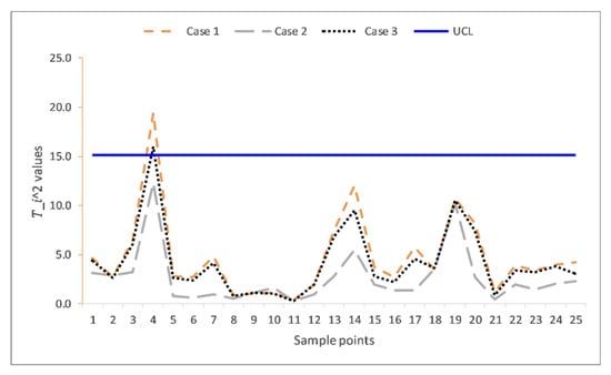 - Case 1-Parameter estimation: Here, we employed the phase-I data to compute the default mean vector and covariance matrix ( and S), assuming the process parameters were unknown, and then used the estimates to compute the plotting statistics for monitoring the phase-II data as explained in (3) and plotted it against the UCL.