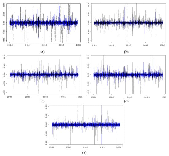 Spot (blue line) and future (black dotted line) 5-min return plots: (a) CAD-5 min, (b) CNY-5 min, (c) EUR-5 min, (d) GBP-5 min, and (e) JPY-5 min.