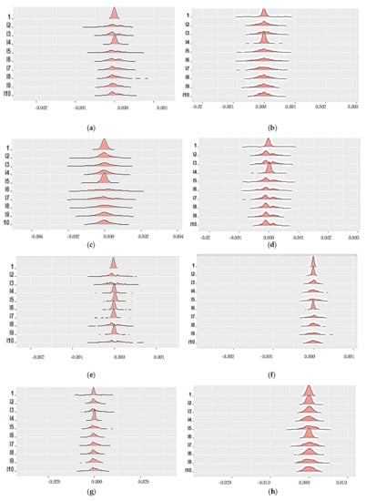 Table 1 and Table 2 present the descriptive statistics of the spot and future prices of the variables at different frequencies. Most currency spot and futures prices have negative means. The standard deviation (Std) of both the spot and future series is close to zero, indicating the low dispersal of data points or return levels. The largest Std for both the spot and futures belongs to the daily returns of JPY at 0.0073 and 0.0071, respectively, suggesting the high dispersal of return levels, with some distance away from the mean. Meanwhile, the smallest Std for both the spot and futures is found in the daily returns of CAD and CNY at 0.0002 and 0.0005, respectively. The skewness of some variables is less than 0, meaning that the returns are distributed skewed to the left, and if it is greater than 0, it is said to be negatively skewed. The largest skewness was presented in the 30-min spot returns of CAD. As a measure of the tailedness of the data distribution, the kurtosis of both spot and future returns at 5-min and 30-min intervals, including that of future returns at 60-min intervals, had values indicating that the distributions had heavier tails than a normal distribution. The kurtosis of 5-min JPY future returns, in particular, had a value as high as 15.3740, much higher than the highest point of the bell-shaped curve of a normal distribution. The remaining data series had kurtosis values lower than that of the normal distribution (=3), meaning that their distributions were lightly tailed. Figure 1 reveals the high-frequency data of the spot and future returns of five currencies to exhibit a high fluctuation over the whole sample period. The spot currencies seemed to be more fluctuating than the futures. Figure 2 presents the histogram-valued data in the first ten sample periods. We can see that the variation of the 5-min spot returns is not greater compared with the futures counterpart.