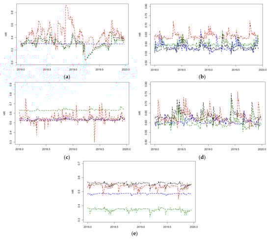 To obtain a better picture of time-varying evolution, we illustrated the evolution of the time-varying hedge ratio between the spot and futures returns over the full sample period. These time-varying hedge ratios were computed from the MSDC-GARCH model with 5-min data (presented by the blue dotted line), 30-min data (presented by the black dashed line), 60-min data (presented by the red dashed line), and daily data (presented by the green dashed line) and are shown in Figure 3. We can observe that there was a substantial time-variation in the optimal hedge ratio for all currencies in most frequencies, arguably only for 5-min data, as there was some stability in the HR. Nevertheless, all time-varying hedge ratios exhibited a mean-reverting pattern and were stationary.