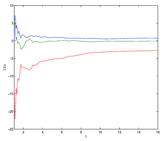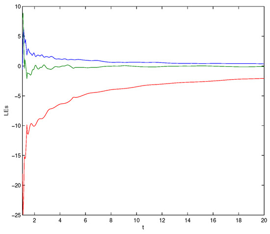 To obtain the numerical simulations, we used the modified predictor–corrector method [32]. Moreover, to investigate the chaos phenomenon of the system (18), we modified the MATLAB code proposed by Danca et al. [33], and this phenomenon could be identified by calculating the Lyapunov exponents (LEs). The corresponding Lyapunov exponents of system (18) were and Figure 1 depicts the dynamics Lyapunov exponents, which showed that the first Lyapunov exponent was positive. This implied that the Chen system (18) was a chaotic system. Figure 2 displays the chaos of system (18) at and the initial condition The initial conditions of drive system (18) and the response system (20) were taken as , and respectively. In addition, the corresponding initial condition of the error system was given by