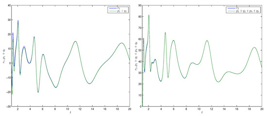 and this led to Moreover, since the eigenvalues of were and this implied that the condition of the spectrum of matrix satisfied. Thus, all hypotheses of Theorem 2 were achieved, and we could deduce that the combination synchronization phenomena were satisfied.