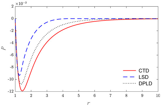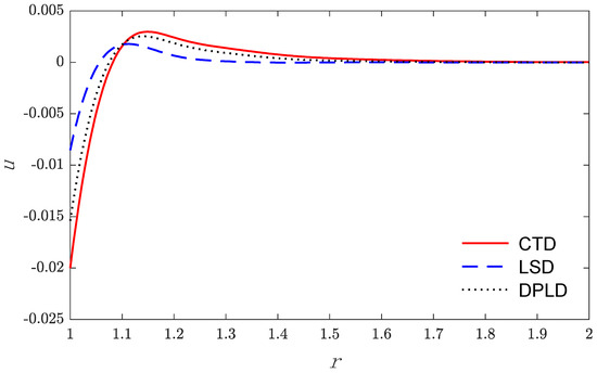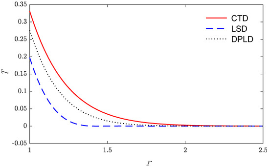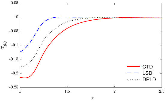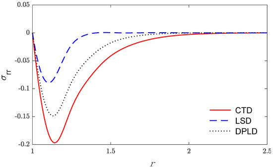The computations are performed for the estimations of time , presence and absence of different time delay parameters. The finite element method is employed to obtain the natures of the radial displacement, the temperature, the concentration, the chemical potential with the radial and the shear stresses distribution with respect to the radial distance . The grid size has been refined until the values of considered fields stabilize. Further refinement of mesh size over 20,000 elements does not change the values considerably. Thus, the grid size 20,000 has been used for this study. Figure 2 shows the variation of radial displacement along the distance . It is noted that the radial displacement has maximum negative values at the internal surface of hole . The magnitude of radial displacement increases from the negative values to positive values. In these values, the radial displacements have peak values that depend on the type of model. Figure 3 represents the variations of temperature with respect to the distance . It is observed that it always starts from the difference of certain values according to the values of with the increasing of the radial distance to reach zero values. Figure 4 represents the deviation of radial stress with respect to the radial distance for different models. It is easy to see the radial stress decreases from zero which satisfy the problem boundary conditions to maximum negative values, and after that increases quickly as the radial distance increases, then the stress decreases to zero. Figure 5 displays the variations of hoop stress versus the radial distance for three different models. It is observed that the magnitude of hoop stress starts from maximum values which depend on the type of model, then increases with the increase of the distance to close to zero. Figure 6 displays the distribution of concentration versus the radial distance . It is clear that the concentration has maximum values at the internal surface of the cavity after which it decreases with the increase of distance Figure 7 shows the variations of chemical potential versus the redial distances. From Figure 6, it is observed that the chemical potential begins from zero value, which agrees with the boundary condition, and increases with the rising of the radial . The chemical potential has peak values that depend on the value of the type of model.
